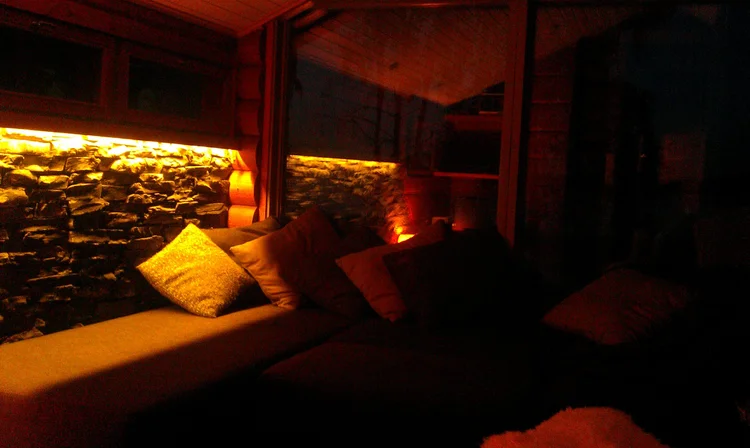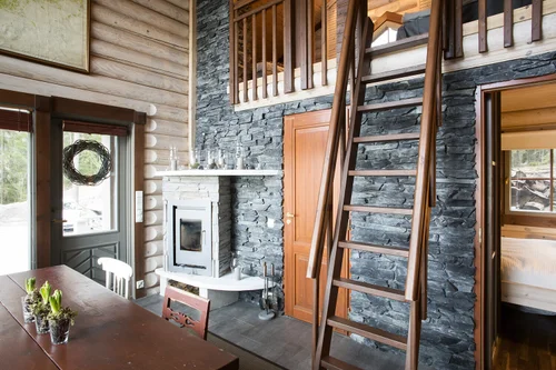 Perinteiseen tyyliin sisustettu saunatupa. Luonnonkivi ja hirsi sointuvat hyvin yhteen