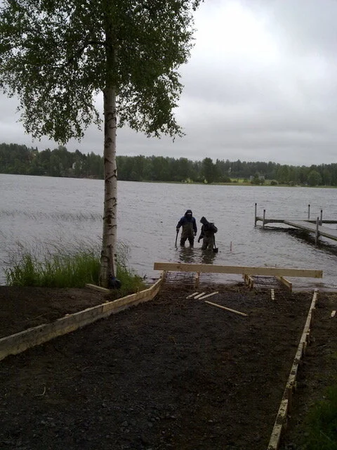 Istutuslaatikot valmistumassa kivestä lehtikuusesta rakennetun terassin yhteyteen