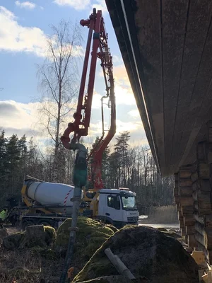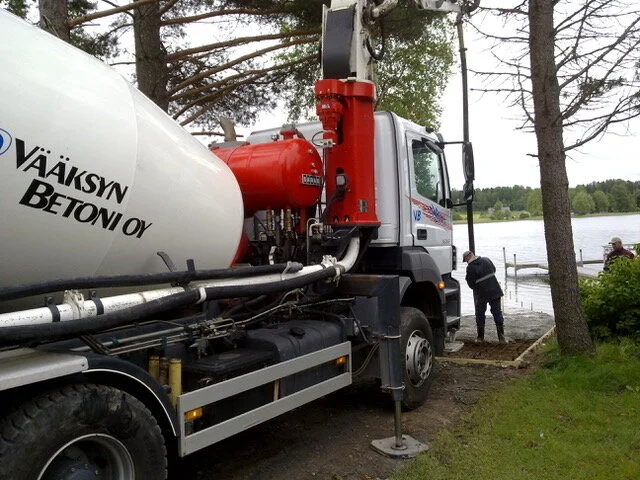 Betoniauto on saapunut, valu alkamassa. Puomi ylettää kymmenien metrien päähän autosta