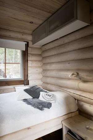 Puusepän käsityönä tekemät sänky ja yöpöytä ovat mitoitettu tehokkaasti huoneen mittojen mukaisesti, materiaalina koivu