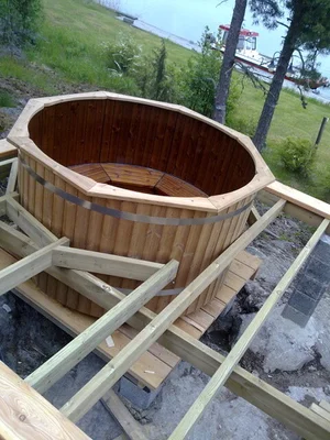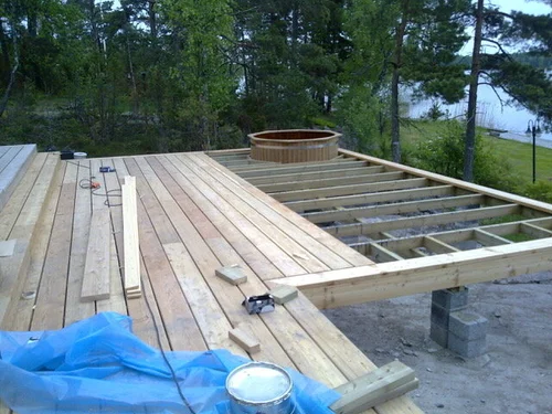 Terassin palju asennettu ja lehtikuusilaudoitus käynnissä