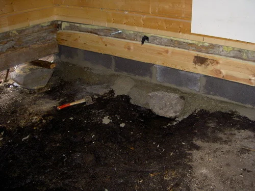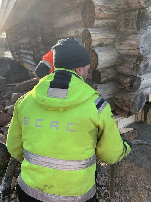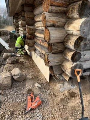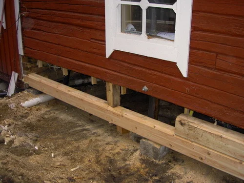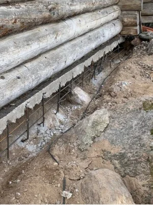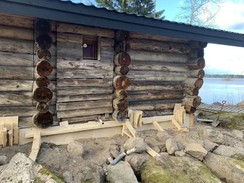 Vanhan hirsirakennuksen uuden perustuksen teko talon alle ja alahirsien vaihto uusiin