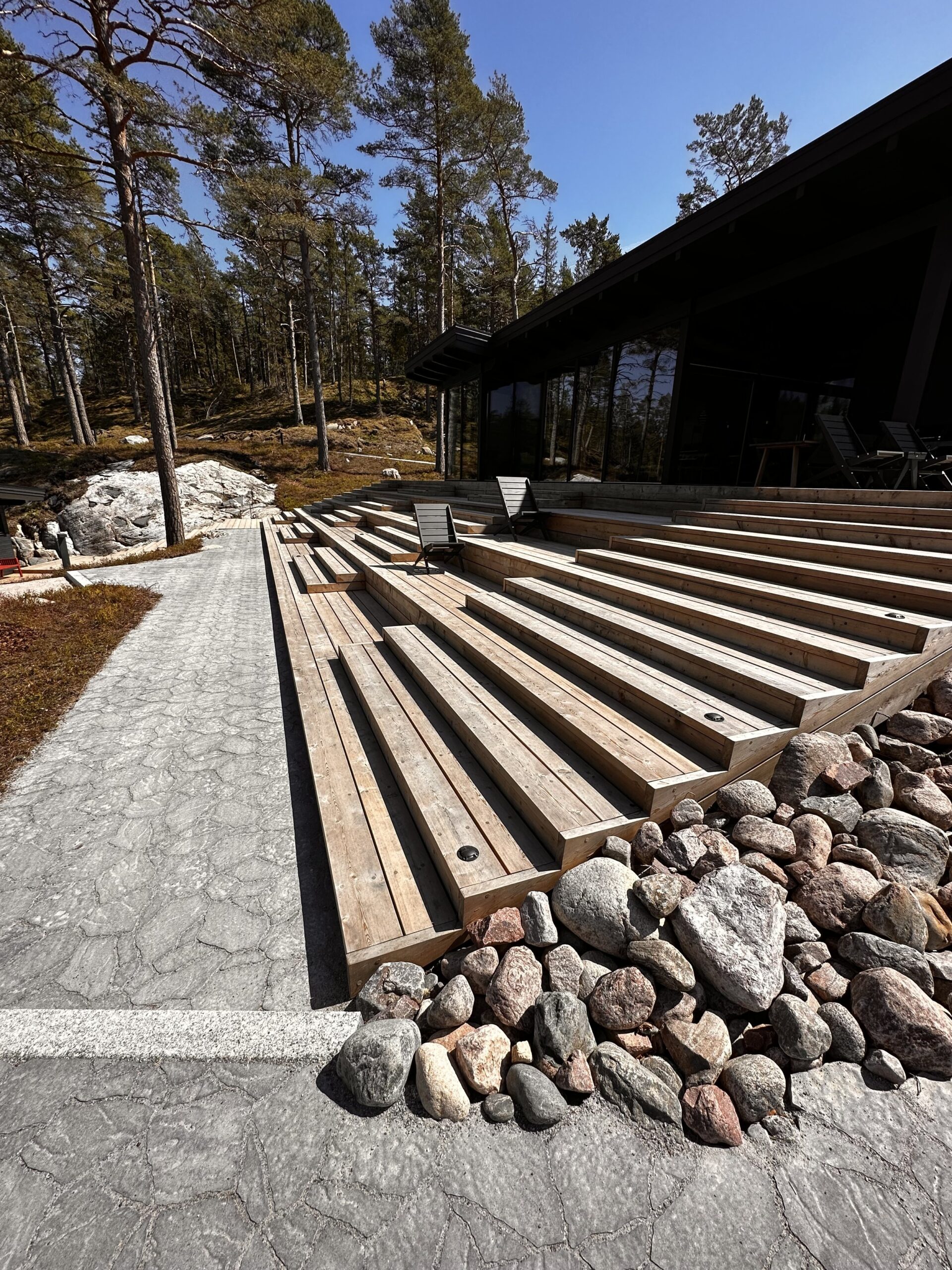 Koko huvilan levyiset portaat istumalaatikkoineen mahdollistavat kaiteettoman terassin.